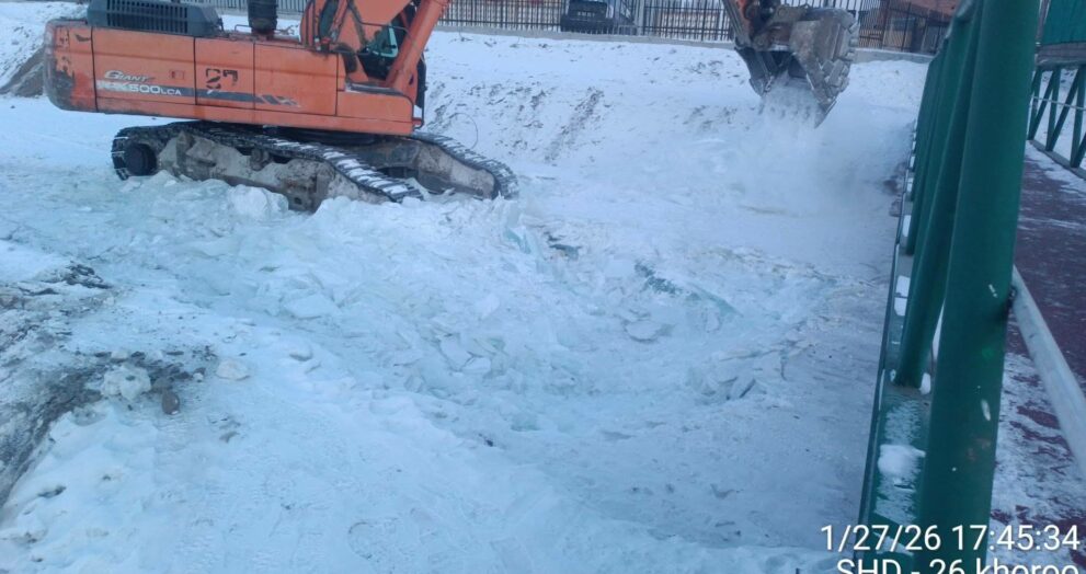 2026.01.28-ний өдөр. Дүүргийн 26, 27 дугаар хорооны нутаг дэвсгэр буюу ЗДТГ-ын баруун талын үерийн даланд урсах халиа, дошинг ухаж мөсөн далан босгох, урсацийг хэвийн болгох, 26 дугаар хорооны нутагт дэвсгэр гүүрэн байгууламжид тулж хөлдсөн мөсийг ухаж урсацийг хэвийн болгох ажлыг 2026.01.28-ны өдөр хийж гүйцэтгэн ажиллаж байна.